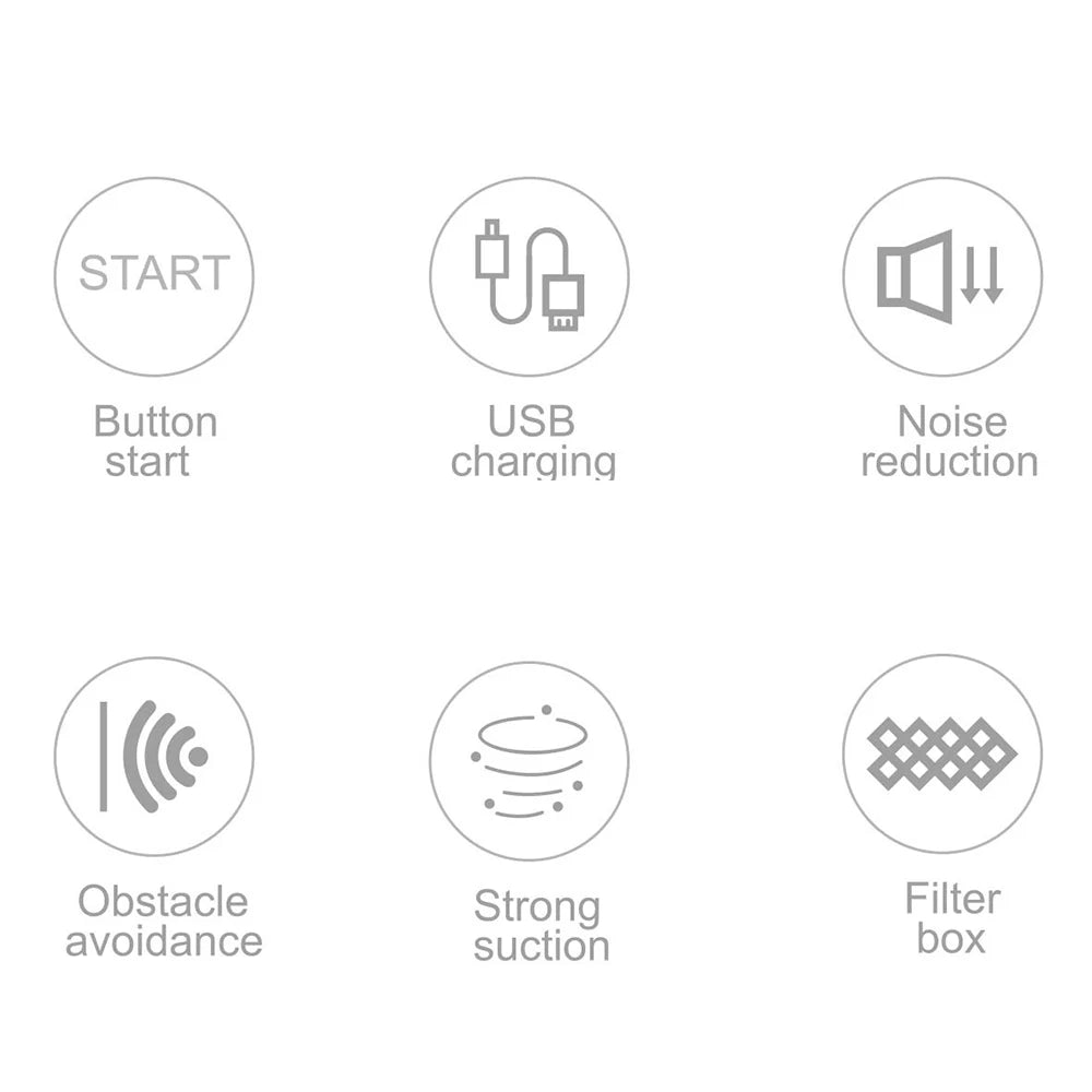 1. Button switch, USB charging cable, reducing noise, avoiding obstacles, strong suction, filter box